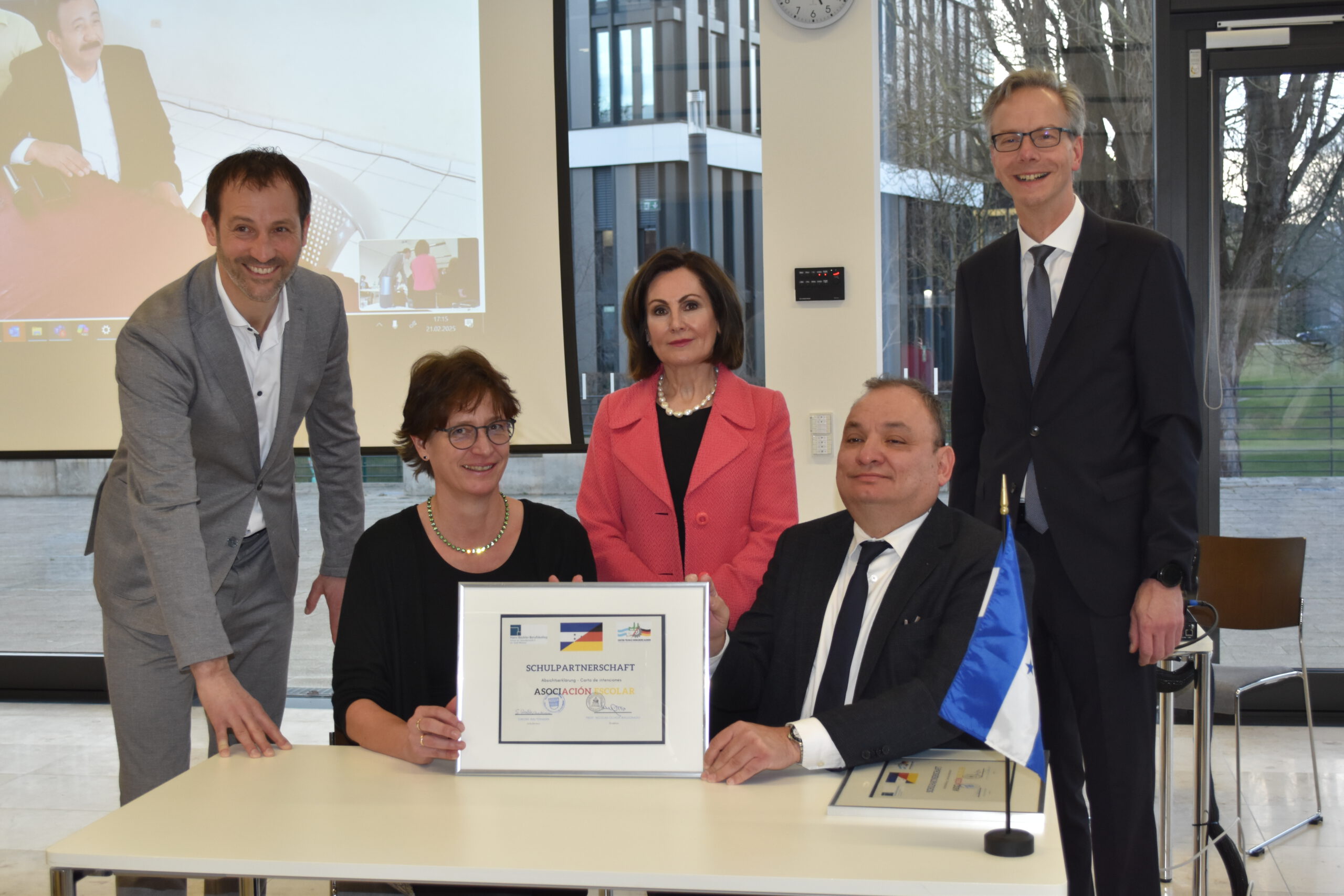 Carsten Taudt, Geschäftsbereichsleiter Bildung und Fachkräftesicherung bei der IHK, Simone Waltermann, Schulleiterin des HBBK, Irene Janssen, Honorarkonsulin für die Republik Honduras, Mauricio Arturo Bueso Chinchilla, Botschafter Honduras, und Dr. Ansgar Scheipers, Regierungsvizepräsident der Bezirksregierung Münster (v.li.n.re.) und Prof. Nicolás Ochoa Maldonado, Direktor des CTHA (auf der Leinwand) freuen sich gemeinsam über die deutsch-honduranische Schulpartnerschaft.